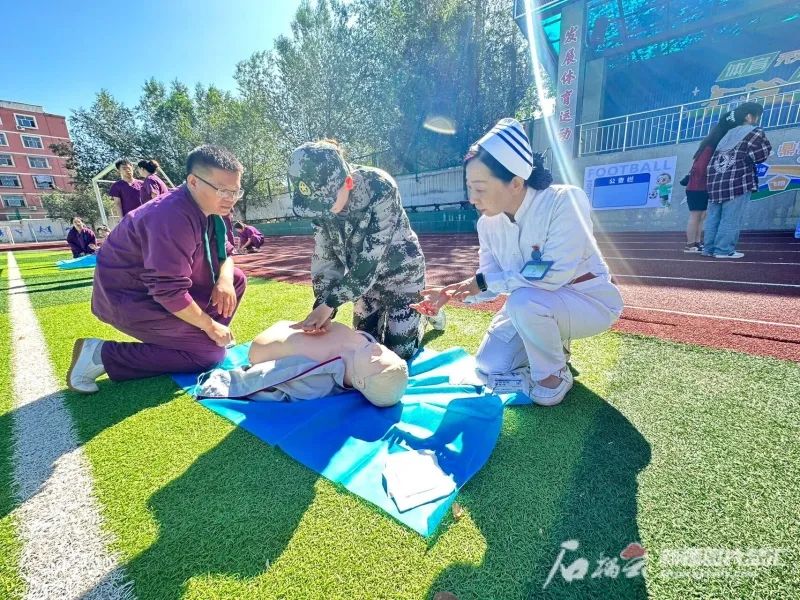 听完讲解,台下的新生跃跃欲试。随后,他们来到操场上,在医护人员示范后,以两人为一组进行急救操作练习。20名医护人员穿行在新生队伍中,手把手帮助学生找准实施急救的正确部位。