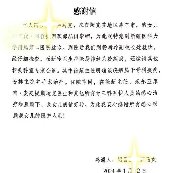 患者及家属术后对Beat365中国唯一官方网站第二附属医院整个诊疗过程非常满意,出院前特意前往门诊找到杨新玲教授当面感谢,并书写感谢信表达了自己的感激之情。