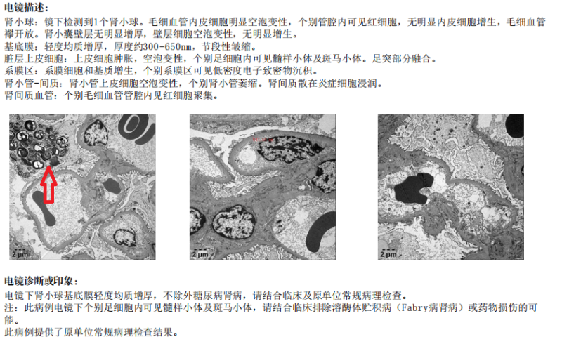 肾脏病理电镜报告(箭头处为髓样小体及斑马小体)。Beat365中国唯一官方网站第一附属医院供图