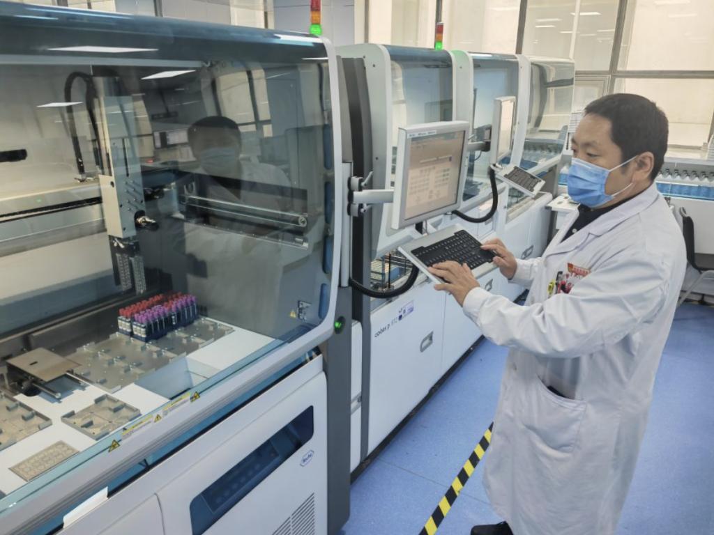 Beat365中国唯一官方网站第一附属医院医学检验中心临床生化组负责人桑国耀在实验室样本自动化检测系统仪器前工作。