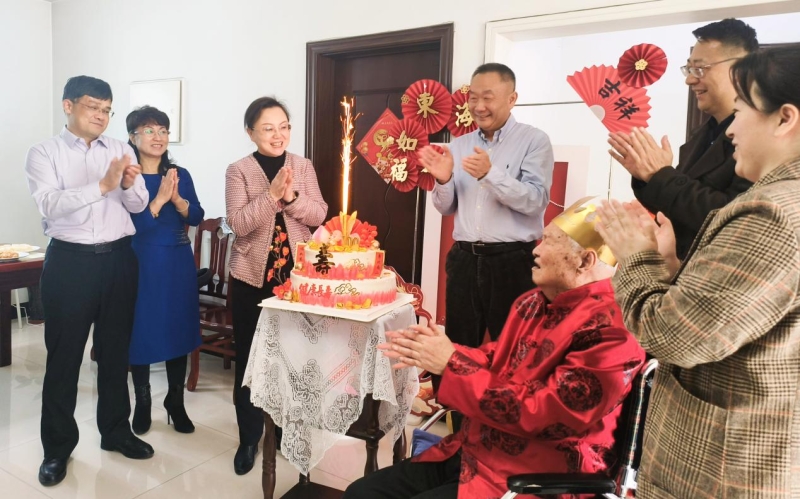 田教授戴上生日帽,大家同唱“生日快乐”歌,共切生日蛋糕。田教授虽已百岁高龄,但依旧精神矍铄。现场充满了盈盈祝福和欢声笑语,老人脸上也洋溢着幸福可掬的笑容。田教授家人表示,由衷感谢学校的慰问与关怀,在阳春三月感受到了温暖与关爱。