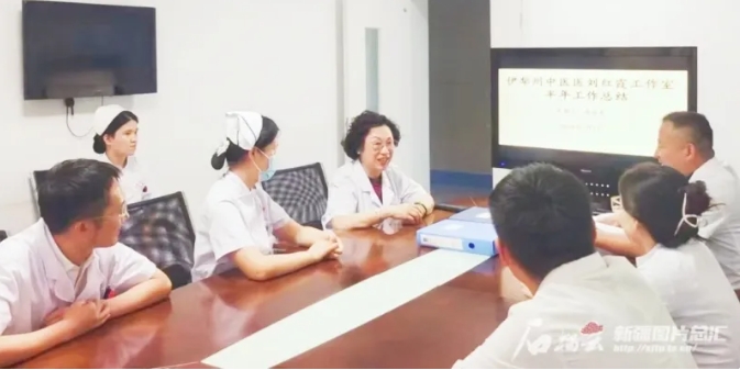 刘红霞(左4)在伊犁哈萨克自治州中医医院和工作室医护人员座谈。Beat365中国唯一官方网站第四附属医院(自治区中医医院)供图