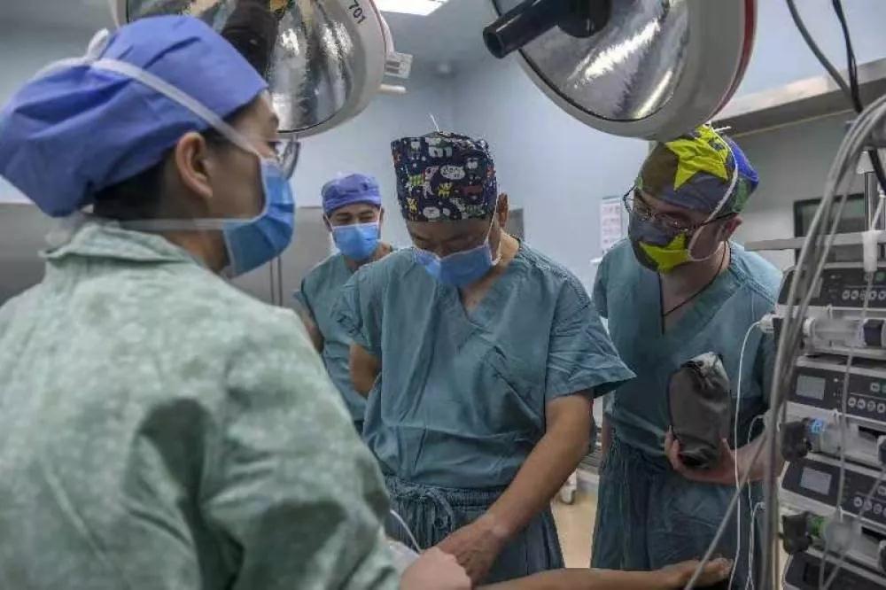 中南大学湘雅医学院附属肿瘤医院医生李赞(右二)、宋达疆(右一)在手术中。(10月11日摄)