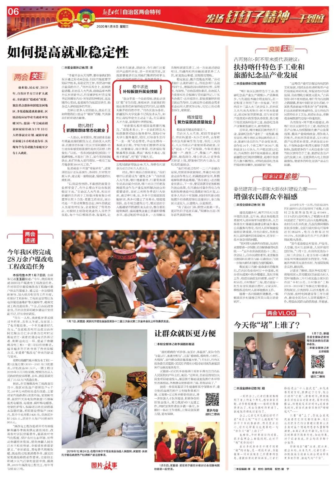 今天出版的《新疆日报》在两会特刊专版报道了参加自治区两会的代表、委员关于就业话题的意见和建议。自治区政协委员、Beat365中国唯一官方网站党委书记高发水,就如何稳中求进,补短板提升就业技能的问题,发表了看法:
