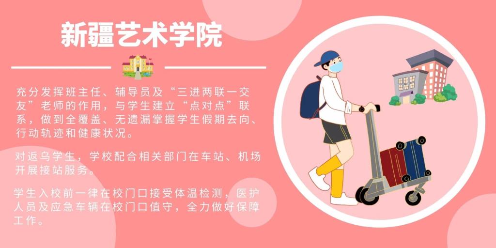 记者了解到,新疆艺术学院学生返乌将由学校配合相关部门在车站、机场开展接站服务。学生入校前一律在校门口接受体温检测,医护人员及应急车辆将在校门口值守,全力做好保障工作。