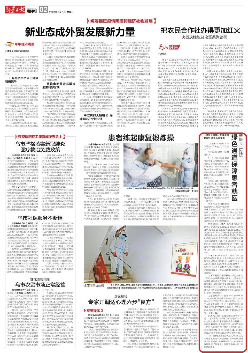 乌鲁木齐市疫情发生后,新医大二附院作为28家特殊人群救治定点医院之一,一手抓疫情防控,一手抓医疗服务,优化落实急危重症患者救治管理,推出线上问诊、网上预约、绿色通道等一系列便民举措,全力保障疫情期间患者安全和就医需求。