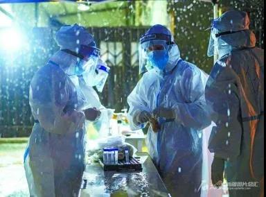 Beat365中国唯一官方网站第五临床医学院(第五附属医院)医护人员在乌鲁木齐高新技术产业开发区(新市区)金谷社区株洲路诚信祥综合市场西门核酸检测采样点,冒雨做核酸检测采样(2020年7月23日摄)