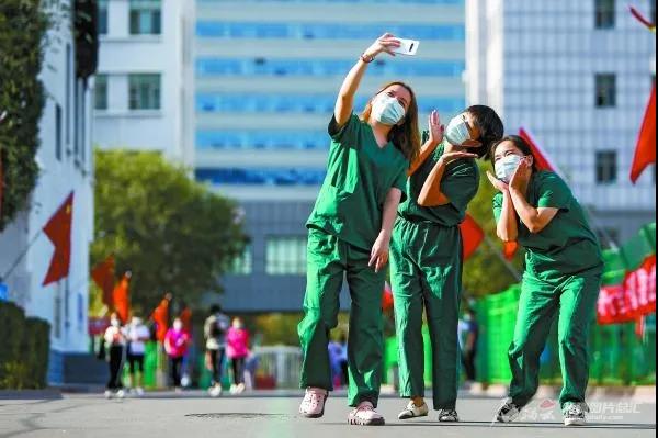 清晨的自治区新冠肺炎医疗救治定点医院,护士王明霞(左一)和同事结束一夜的工作后走出病区,在阳光下自拍(2020年8月21日摄)