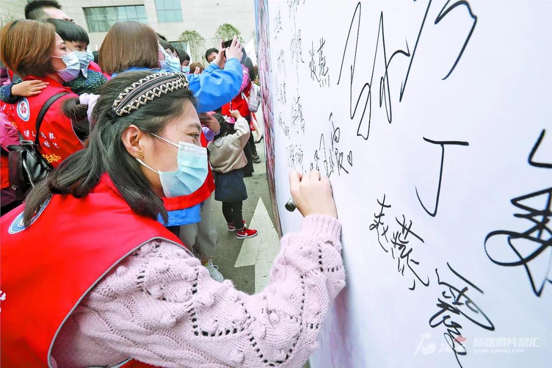 3月12日,新疆援鄂医疗队队员来到曾经战斗过的地方——武汉大学人民医院东院,在签名墙上签名