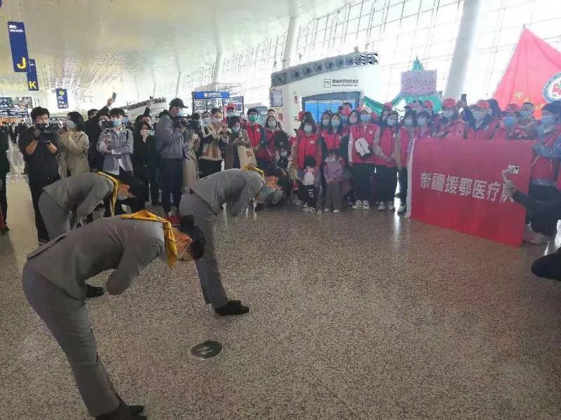 机场工作人员与新疆援鄂医疗队员一起跳新疆舞