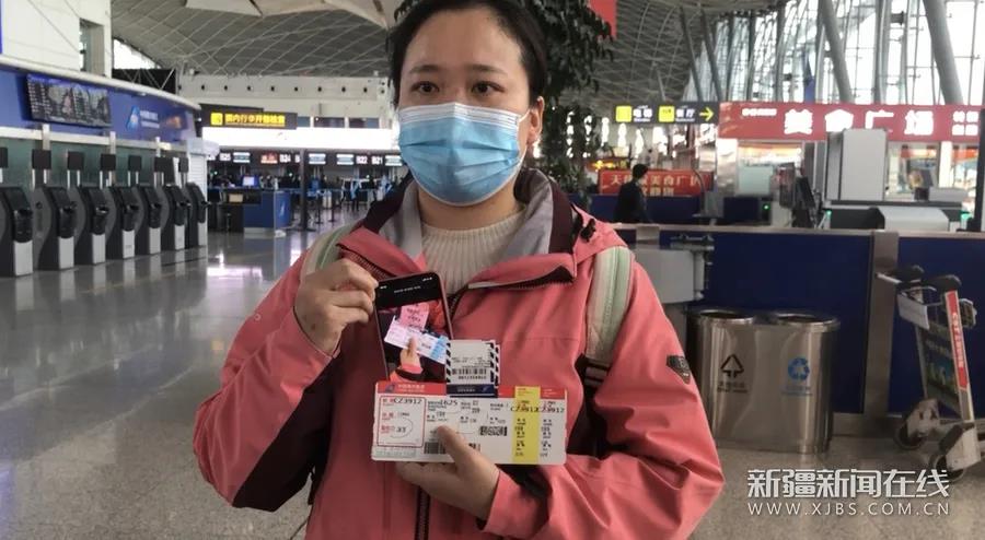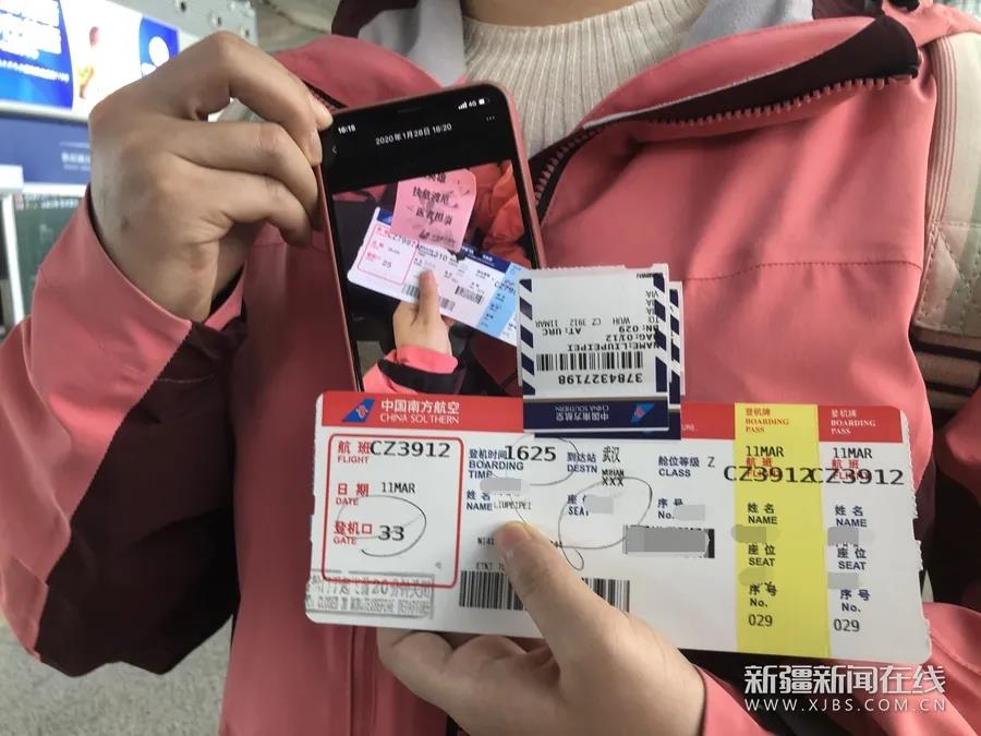 新疆首批支援湖北医疗队队员刘培培给记者展示2020年支援武汉时的机票和今天的机票