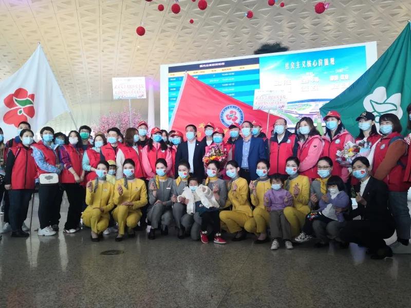 在旅客通道出口,武汉大学人民医院工作人员精心制作的欢迎横幅格外醒目:“樱花烂漫,英雄归来;幸而有你,山河无恙——武汉大学人民医院(湖北省人民医院)感恩全国抗疫战友”,“樱花盛开日,重叙战友情——向用生命保卫过武汉的抗疫英雄,致敬!”“同新协力,疆鄂情深”。